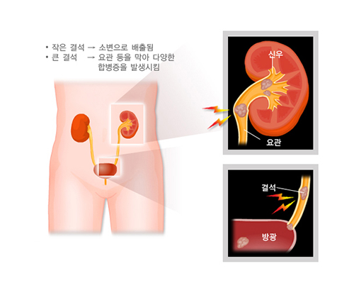 요로결석의 증상은 결석이 어디에 생겼느냐에 따라 달라지는데 통증, 오심, 구토, 혈뇨가 주요 증상입니다.