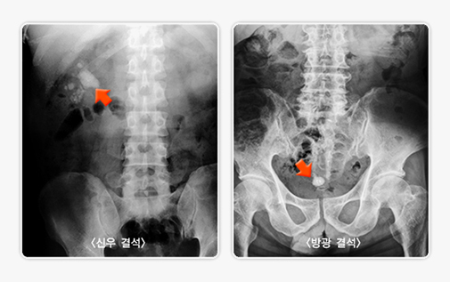 복부의 X선 사진으로 대부분의 신장에 생긴 결석을 발견할 수 있으며 신장 결석의 위치와 크기를 알 수 있습니다. 그러나 일부 특정한 성분(요산)으로 구성된 결석은 방사선을 투과시키므로 방사선 검사에서 발견이 되지 않을 수 있습니다.