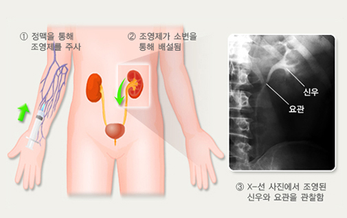 이 검사는 정맥을 통하여 방사선 검사에서 하얗게 보일 수 있는 조영제라는 약물을 투여한 후 이 조영제가 콩팥으로 걸러져 요관, 방광, 요로를 통과하는 동안 방사선 검사를 시행하는 것입니다. 요로조영술은 신장 결석의 위치를 아는데 매우 유용한 검사이며, 만약 결석이 소변의 흐름을 막은 경우는 이에 따른 비뇨기계의 변형을 알아보는 데 도움이 됩니다. 최근에는 컴퓨터단층촬영(CT)이 많은 경우에 이 검사를 대체하고 있습니다.